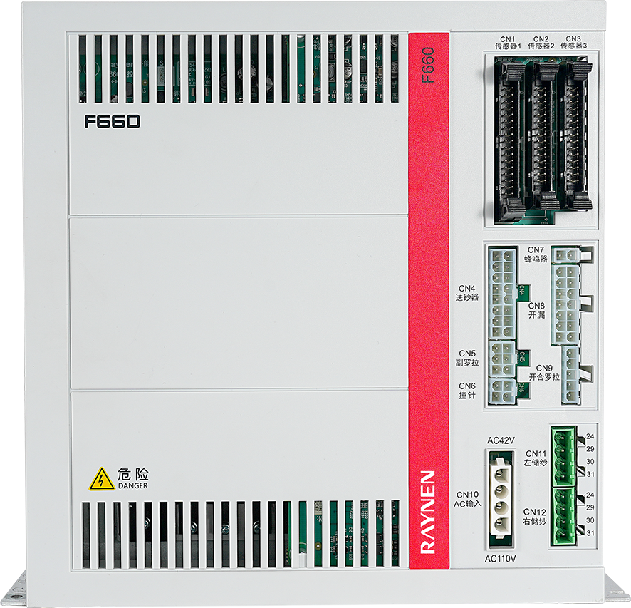 横机电控,是电脑横机的核心部件,它能通过识别打版系统制作的针织打版文件,犹如毛衫的打印机一样,将毛衫或鞋面的设计变为现实,主要由配电盘、主控盒、伺服、起底板、罗拉驱动、机头以及相关线材组成。