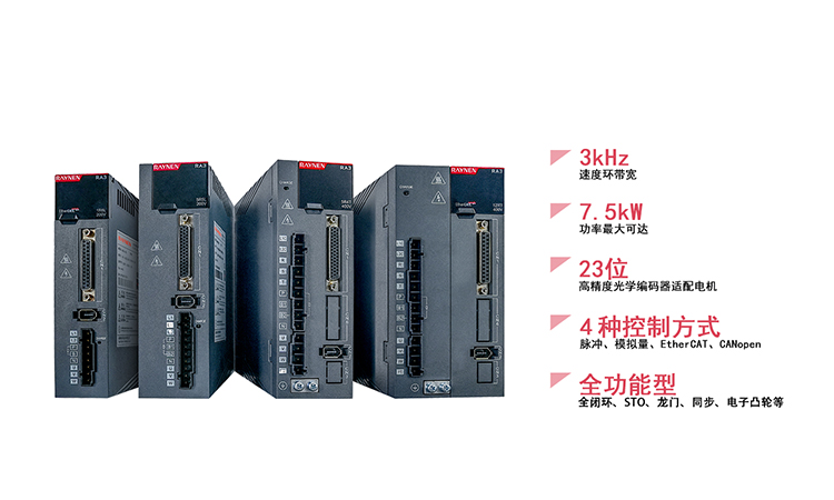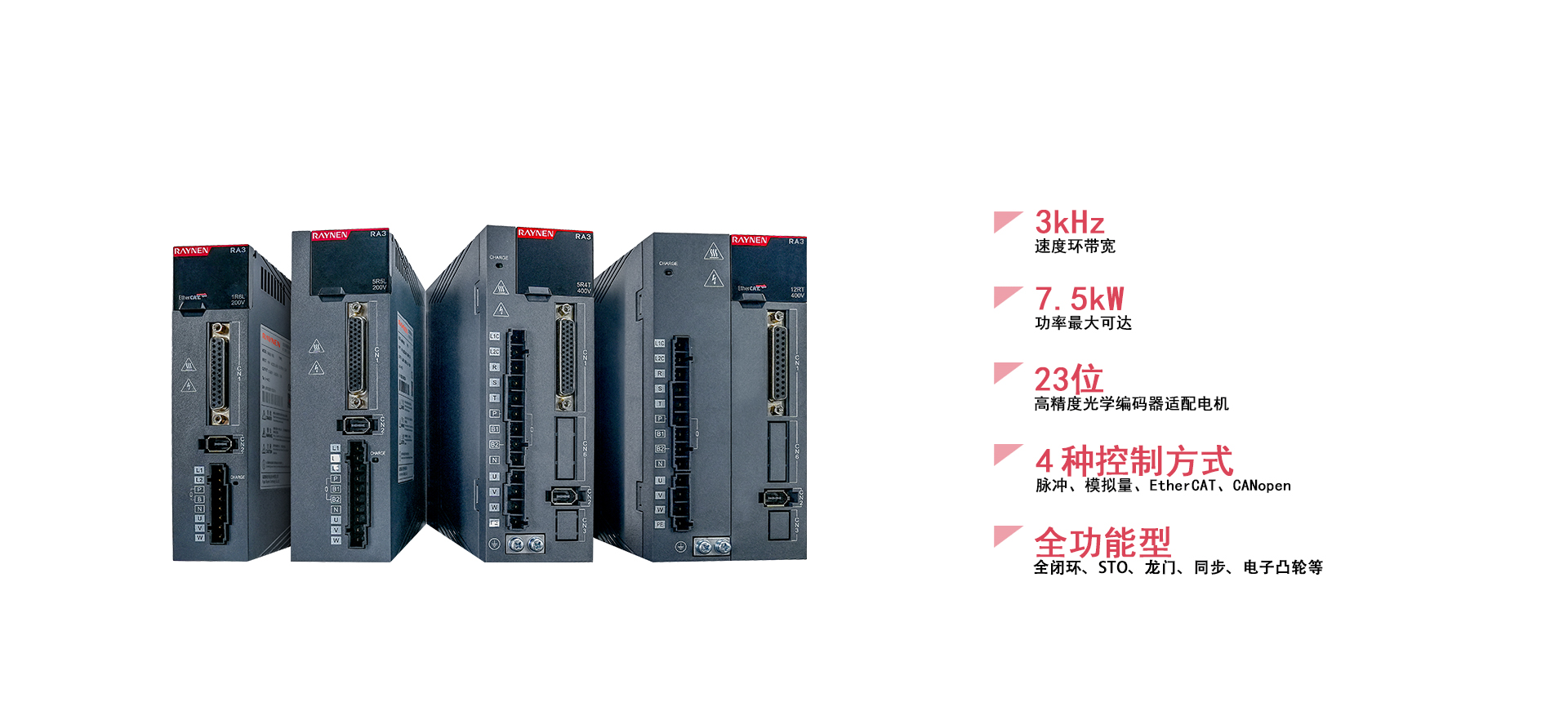 RA3系列全功能型伺服驱动器是睿能科技依托第三代研发技术平台打造的全新伺服产品,具备高精度、高响应、高防护等特点,广泛适用于机器人、锂电、电子设备、纺织、包装、机床和木工等行业,显著提高机械设备生产效率。