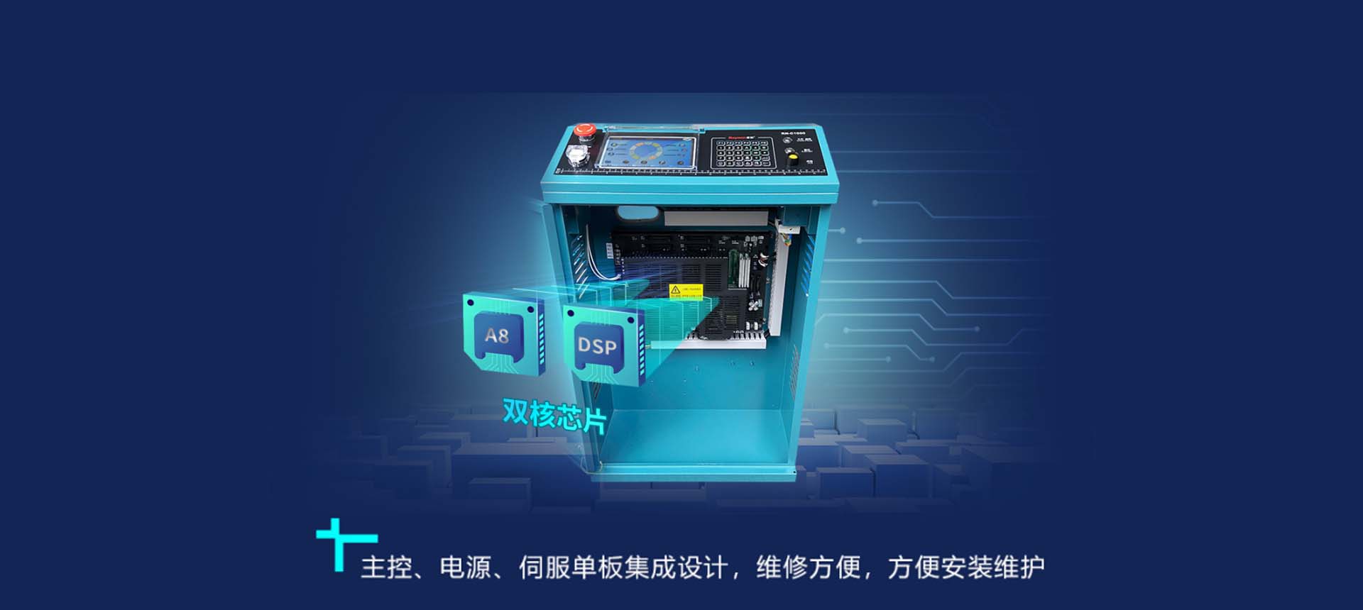双核 A8 芯片,主控、电源、伺服单板集成设计,效率高, 速度快,方便安装维护